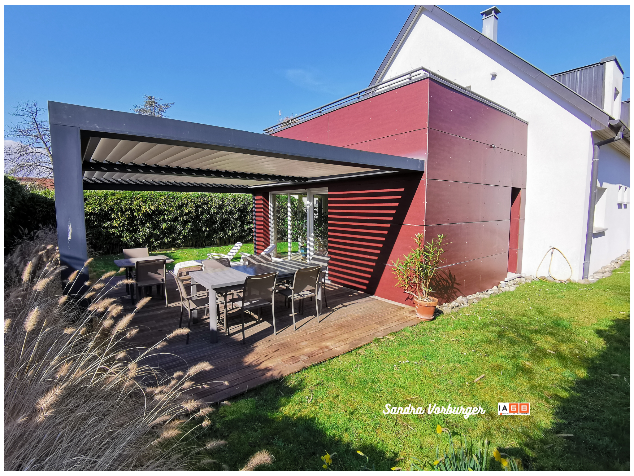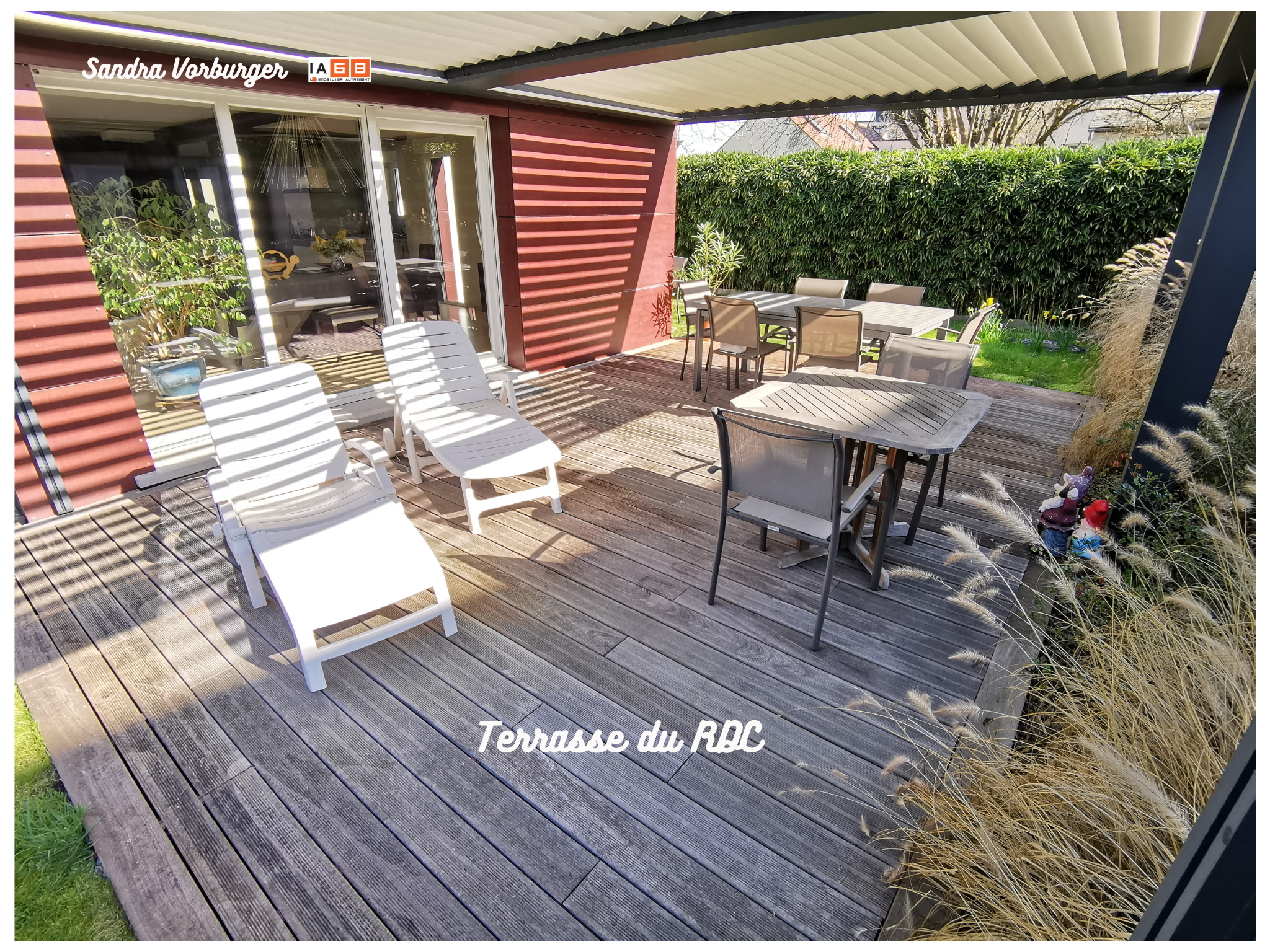 - 1 spacieuse terrasse exposée Sud et équipée d’une pergola, ainsi qu’un peu d’espace vert