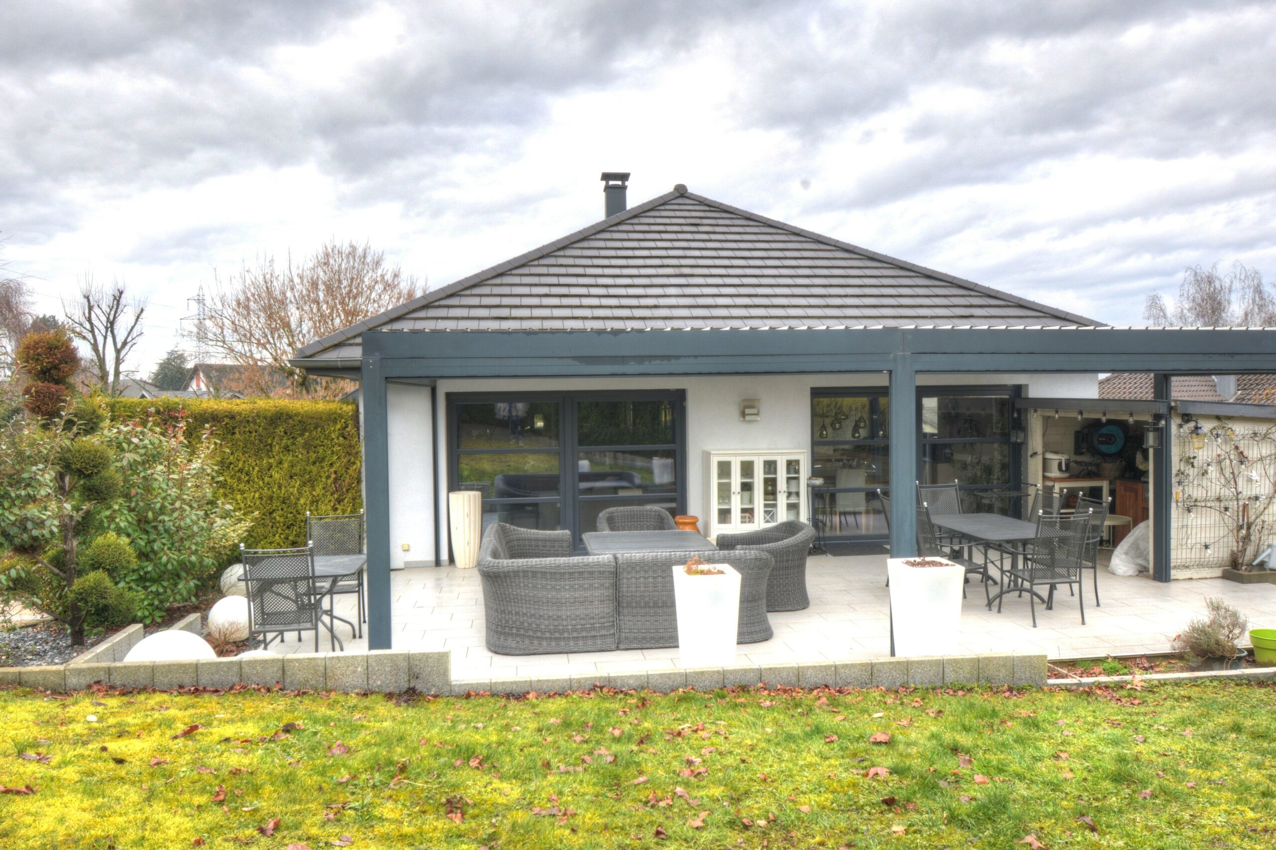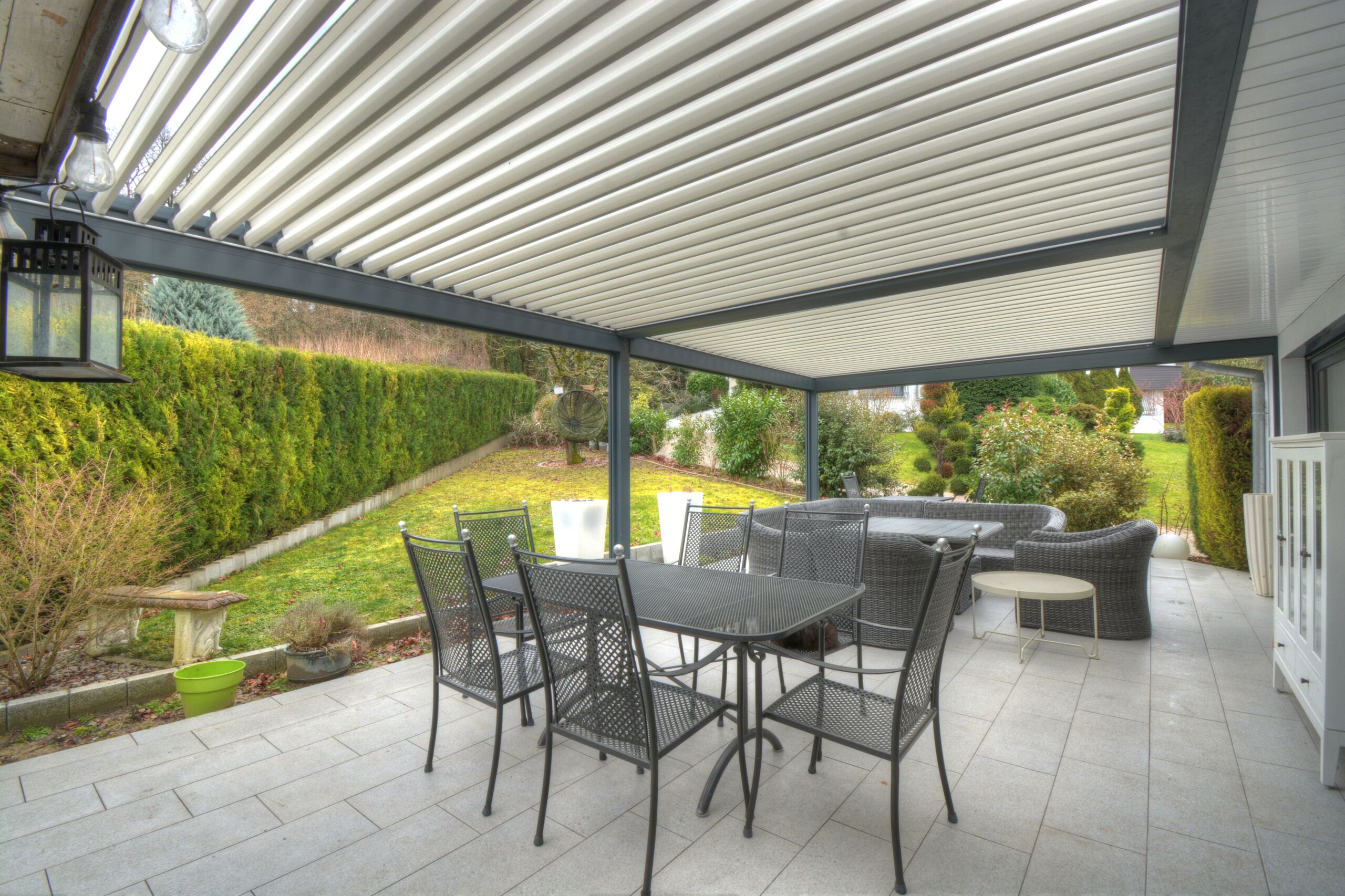 une généreuse terrasse de plus de 50 m² dotée de 2 pergolas biosun,